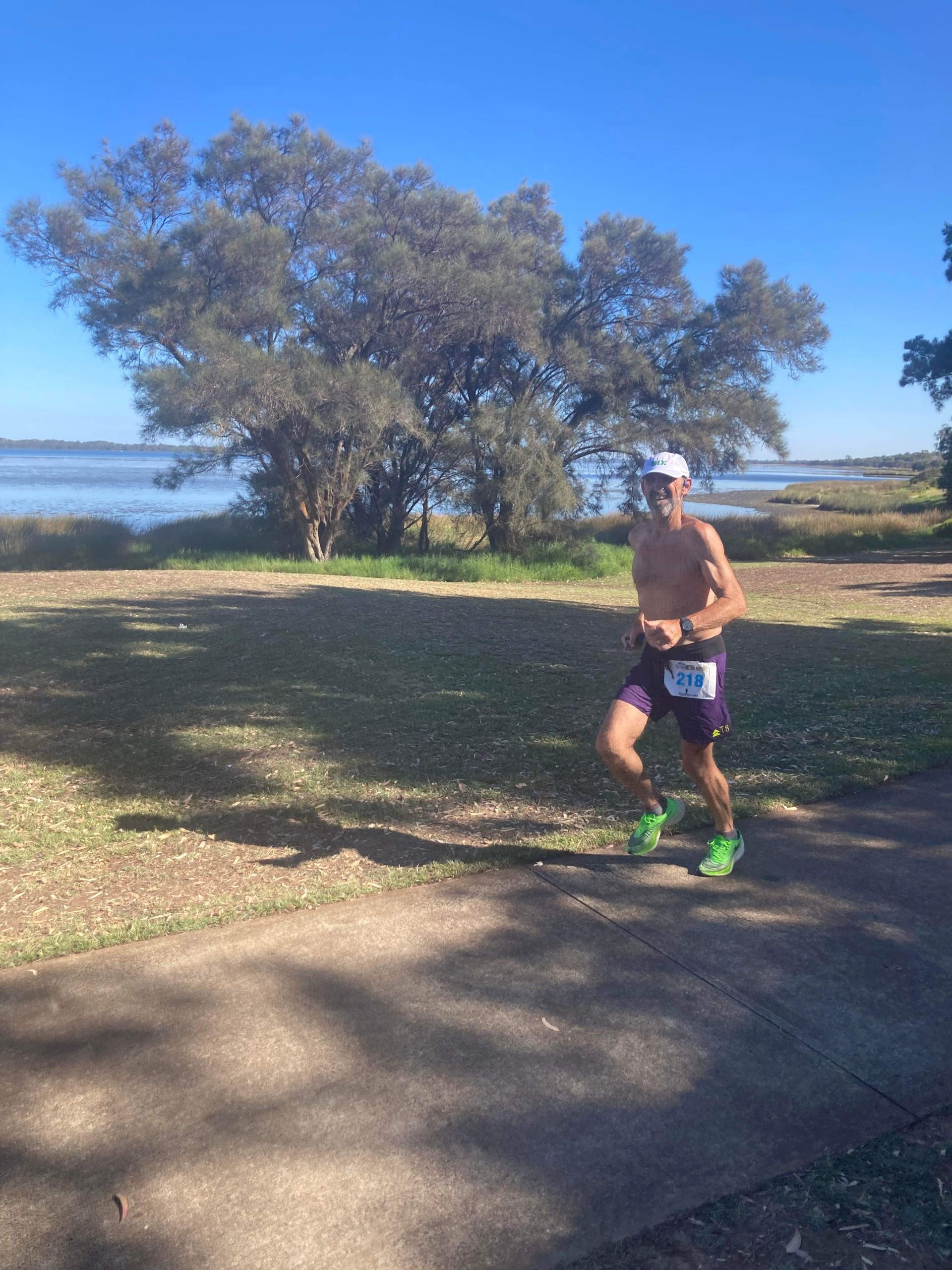 I was comfortably in third place at the end of lap six but noticed the runner in second was coming back to me. My pace had improved to less than 5min/k and I started to reel him in. By the start of lap seven he only had a few hundred metres on me and before the end of that lap I had moved into second place. I’m putting down my fast finish to all the hours spent on my treadmill in the sauna that is a Perth summer. Recovering from a hamstring tear in October I had spent a lot of time walking and running on a 15% incline while listening to podcasts. I really believe this helped me improve my fitness when I started to combine these garage sessions with my normal running.