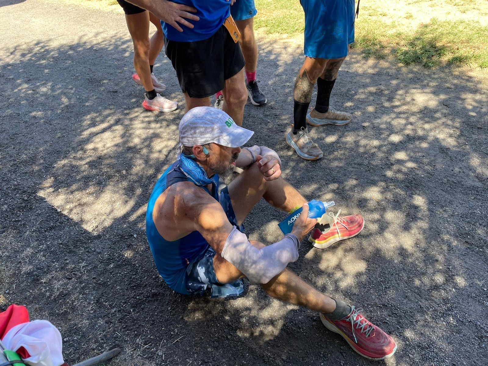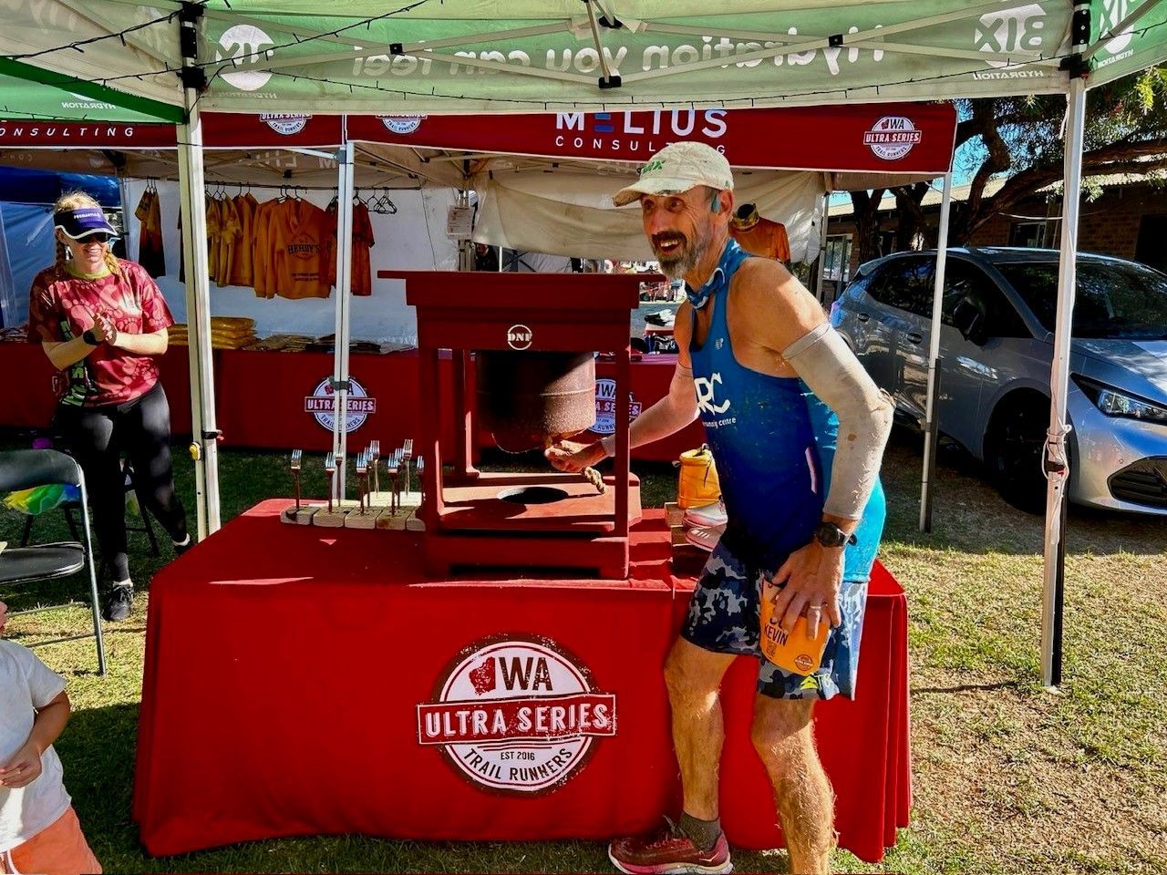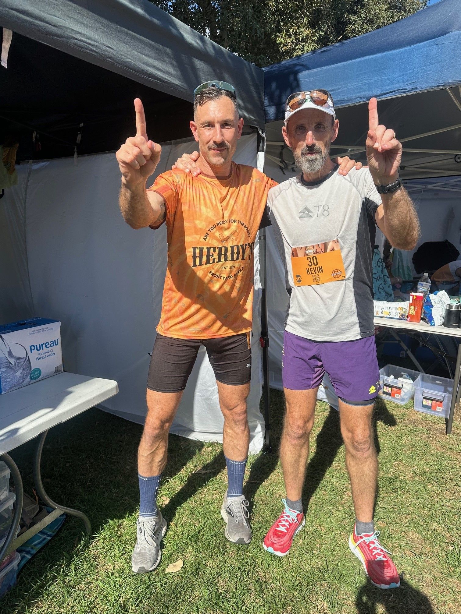 Grabbing a decent spot these days is getting more and more difficult. I was one of many who turned up before the 8am time constraint to grab a spot. With nearly 400 runners space was a premium. It remined me of an old Western style gold rush with gazebos substituted for wagons and horses. Luckily I managed to secure my preferred 3mx3m spot of real estate, close to the start line. With these types of events where you are back at the start line on the hour, every hour, you need to be comfortable in your ‘downtime’. A BCF Wander reclining chair, gazebo and a table are the bare minimum. You then need to add change of clothes, massage gun, fisocrem, food (and lots of it), toiletries i.e. drugs, tape, sudocream, etc., basically a cut down Chemist Warehouse. This year I spied a few weber barbeques, enough fairy lights to be visible from space and heaters and fans of all shapes and sizes. Every year people get more and more ingenious, I’m sure I’ll see a blow up pool one day.