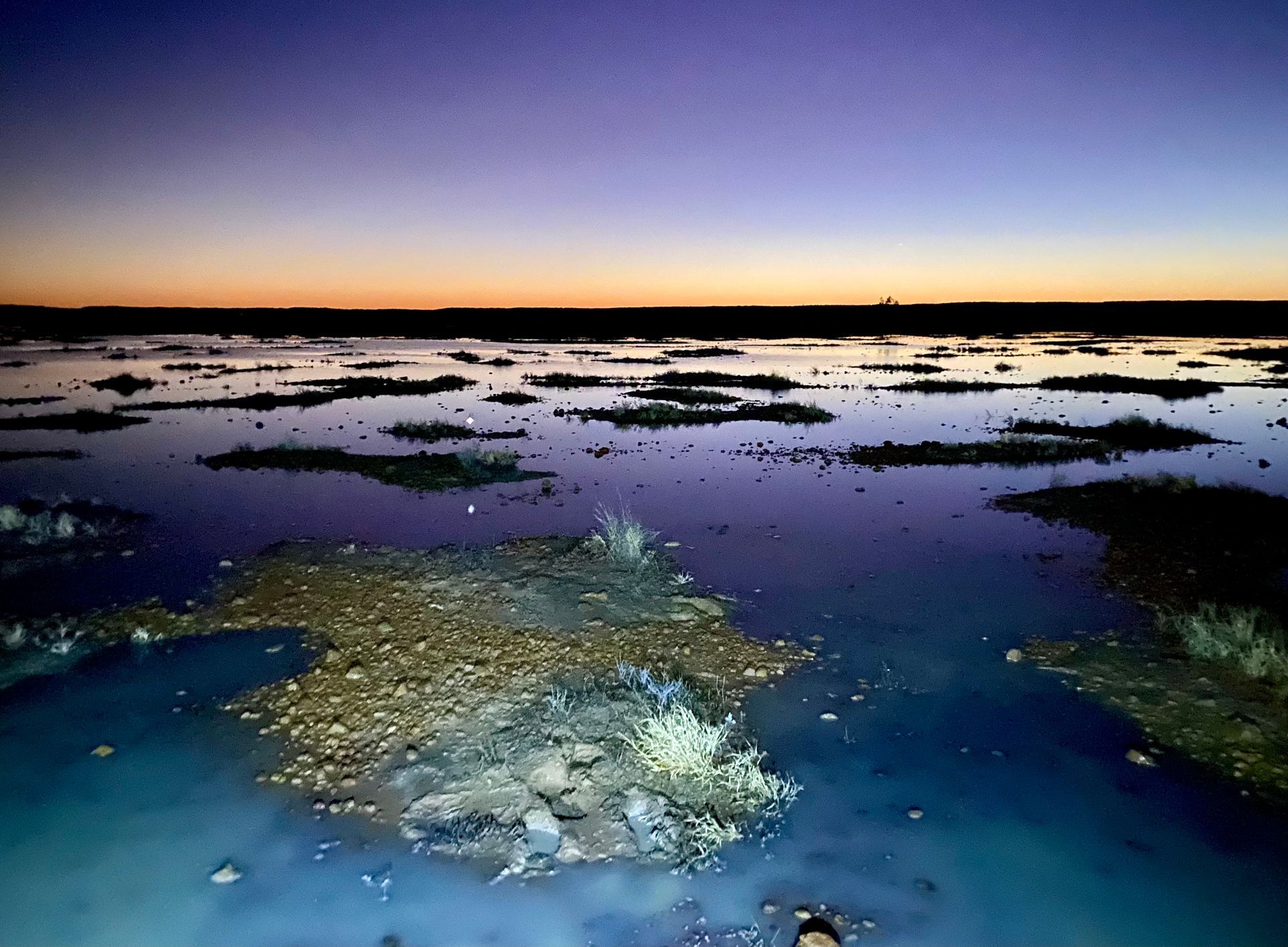 Given the harsh conditions, I started my 100km adventure at 6pm, anticipating at least 18+ hours to complete the course, based on course knowledge gleaned during the inaugural SDU. Unlike 2021, when I ran the first lap predominantly alone, this year I was accompanied at the start by several others, all entering the first flooded plain as the desert sun was setting. I had the privilege of traversing most of the first (North) loop with SDU grand slammers (i.e., participated in all 4 SDU events), John and Lesly, who are renowned for "sliding" into Birdsville each year in their mighty sticker-clad 2WD Corolla.