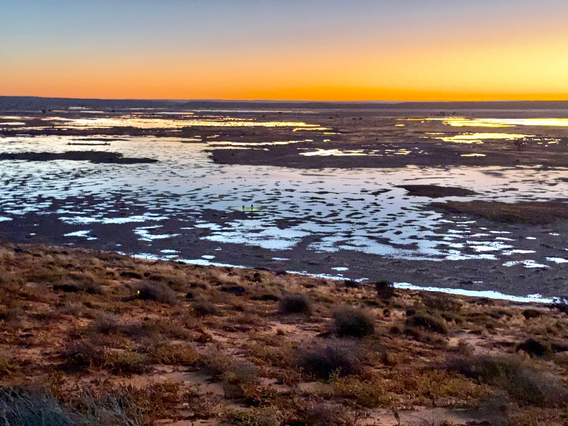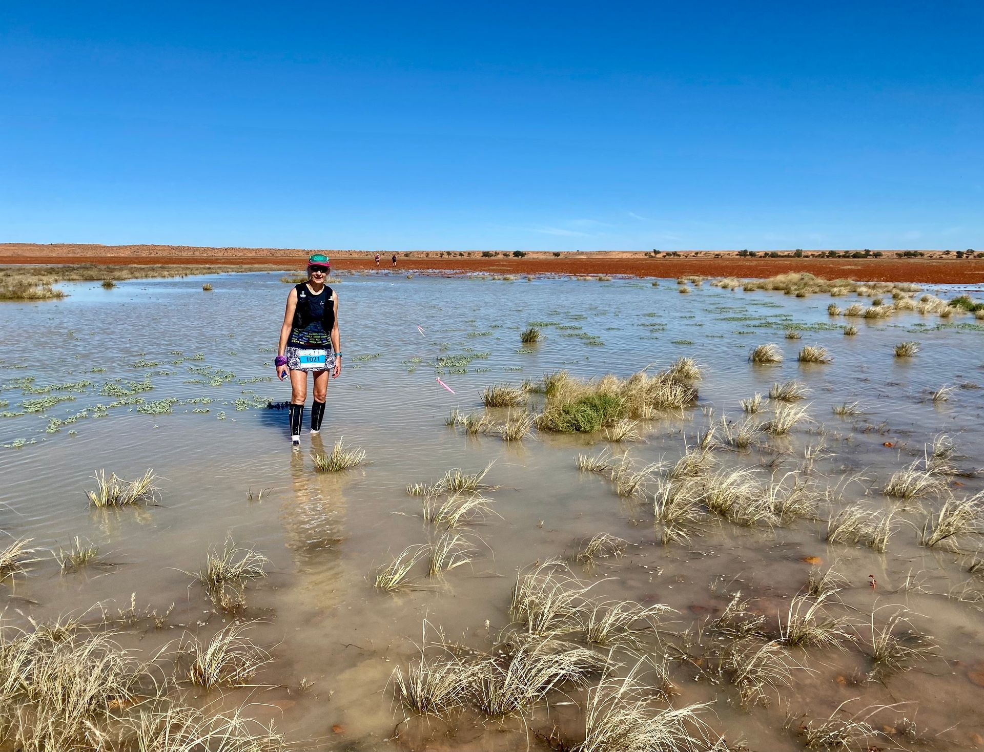 However, much of the course was substantially flooded, with panoramic views from dune tops looking more like a coastal reef than an inland desert. The water transformed the gibbers and clay pans into slippery quagmires or icy ankle-deep lakes hiding mystery objects beneath the opaque surfaces. Wading rather than running through the water was often the only option to minimise getting soaked from excessive splashing or twisting an ankle on hidden gibbers.