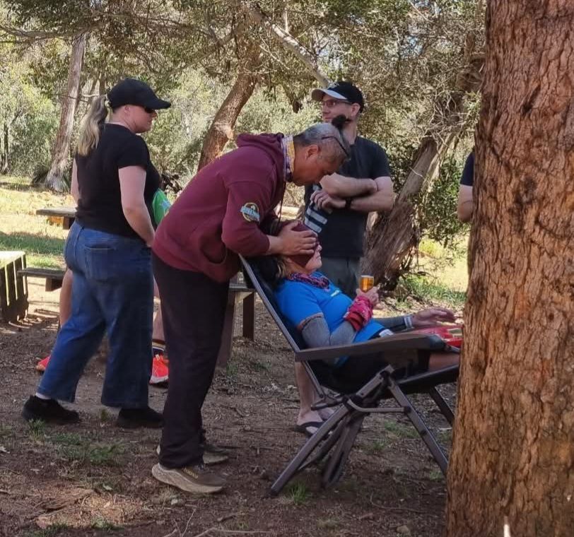 As we got closer to Kalamunda we still had the occasional runner coming back towards us, jealous they were on the finish leg, but we were still doing ok. Eventually we made it to Jorgensen Park, and followed the flagging and signs that would take us to the aid station, thank goodness. I was definitely feeling the heat by now, and was spoiled by Carl who was on this aid station, along with Jill and Frank. Carl had wet buffs on my head, and I had been put in a reclining chair, and I was given ginger beer, ice, and fruit. We were doing alright time wise now, so long as we didn’t hang around too long. Bianca and I made the trip to the toilets, and then we really needed to get going. Gabe and Byl arrived and gave us hugs, sadly Gabe had pulled out at Allen Rd, I was gutted for him. Hugs and thanks to Kalamunda Aid, we were on the downward path back to the finish line, hell yes. Lots of downhill steps, definitely easier than uphill, but legs were feeling it all. Hot now, it was midday, and I was being careful, making the most of shade, and stopping if I needed to rest and recover. As we got closer to Camel Farm I asked if Nick could check out the Camel Farm café and see if they had ice poles….